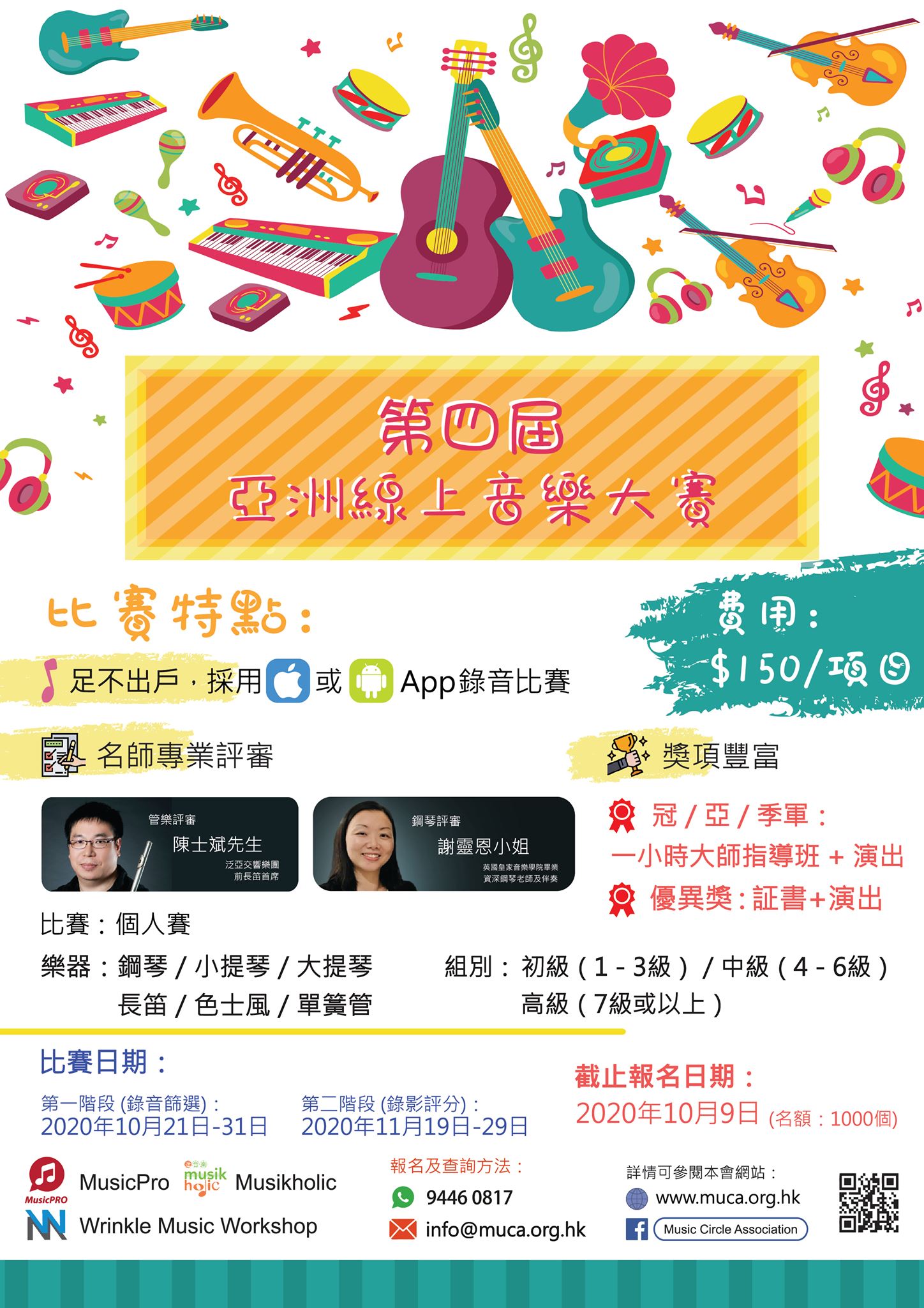 我地第四屆亞洲線上音樂大賽又黎啦! 可以俾你足不出戶,簡單download個App就可以參加音樂比賽。比賽將於2020年10月21日開始!現正接受報名(截止報名日期:2020年10月9日)! 🎼比賽特色: 👍足不出戶,download個App就可以參加比賽 👍比賽分兩階級進行: 🏆第一階段:錄音篩選(每組得分最高10位參賽者可進入第二階段) 🏆第二階段:錄影比賽 👍各組別均設冠、亞、季軍,並有機會參加大師指導班作獎勵,並可藉此提升參賽者的音樂造藝,另設優異獎(得分達75分)表揚有好表現之參賽者 👍以ABRSM樂曲或校際音樂節比賽歌曲參賽 👍專業評審團隊,每位參賽者都可得到專業評審的意見 👍費用:$150/項目 👍名額:1000個 👍截止報名日期:2020年10月9日 👍比賽項目:個人賽 樂器:鋼琴/小提琴/大提琴/長笛/色士風/單簧管 組別:初級 (1-3級)/中級 (4-6級)/高級(7級或以上) 👍報名方式: WhatsApp: 9446 0817/Email: info@muca.org.hk
