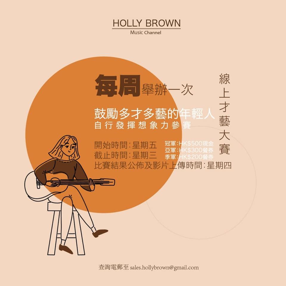 Holly Brown自六月開始舉辦LIVE MUSIC,願景是幫助一群熱愛音樂的年輕人發揮所長,可惜卻因近日新冠狀病毒肺炎疫情日趨嚴峻而取消! 為使大家留在家中抗疫期間亦能發揮多方面的才華,《Holly Brown Music Channel 線上才藝大賽》遂應運而生:讓多才多藝的你,有機會發光發亮! 比賽將每周舉辦一次,影片形式不限(例如動人心弦的音樂短片,幽默詼諧的微影片,令人拍案叫絕的魔術表演......)歡迎大家以各自強項報名參賽! 比賽形式︰ 提交一段3分鐘參賽者的才藝表演短片,必須顯示參賽者容貌,彈奏或歌唱技巧,片段開頭需用中文説“歡迎來到Holly Brown 音樂頻道”或用英語説“Welcome to the Holly Brown Music Channel”。