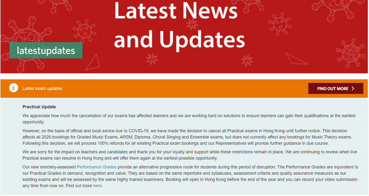 ABRSM (皇家音樂學院) 15/9/2020更新 1.2020年ABRSM的術科全部考試取消(4-5月,8-11月) 2.樂理考試會如常進行 (10月17日及10月18日分五個時段) 考試時段 考試日期及時間 第一節 10月17日上午9時30分 第二節 10月17日下午1時 第三節 10月17日下午4時 第四節 10月18日下午1時 第五節 10月18日下午4時 ABRSM(中文): 我們明白取消考試對考生的影響重大,我們一直致力尋求解決方法,以確保考生能儘早獲得相關資格。 但是,根據官方和地方政府就新型冠狀病毒病的建議,我們已決定取消香港的所有術科考試,直至另行通知。此決定將影響已報考2020年術科等級考試、文憑考試、合唱和合奏考試的所有考生,但目前不影響樂理考試。基於此決定,我們將為所有已報考術科考試的考生辦理100%全數退款。我們的代表處將在適當時候提供進一步的指導。 對於取消考試對老師和考生造成的影響,我們感到抱歉,同時感謝各位在此艱難時期對我們的諒解和支持。我們會繼續檢視什麼時候可以再次在香港再次舉行即場考核的術科考試。 我們全新以演奏為重點的遠程評估等級考試 將為考生在這非常時期,提供了另一種可以向前邁進的途徑。這個以演奏為重點的考試,無論在考試要求、資格認可和價值各方面,均等同於我們的術科等級考試。兩個考試的曲目和考綱相同,評估標準和質量保證準則一致,並且均由曾接受嚴格訓練的考官進行評估。這全新的考試預計將在今年年底以前,開放予香港考生報名,他們從即時起可開始為考試進行錄影。請瀏覽我們網頁查閱更多有關考試的資訊 ABRSM(英文)原文: We appreciate how much the cancellation of our exams has affected learners and we are working hard on solutions to ensure learners can gain their qualifications at the earliest opportunity. However, on the basis of official and local advice due to COVID-19, we have made the decision to cancel all Practical exams in Hong Kong until further notice. This decision affects all 2020 bookings for Graded Music Exams, ARSM, Diploma, Choral Singing and Ensemble exams, but does not currently affect any bookings for Music Theory exams. Following this decision, we will process 100% refunds for all existing Practical exam bookings and our Representatives will provide further guidance in due course. We are sorry for the impact on teachers and candidates and thank you for your loyalty and support while these restrictions remain in place. We are continuing to review when live Practical exams can resume in Hong Kong and will offer them again at the earliest possible opportunity. Our new remotely-assessed Performance Grades provide an alternative progression route for students during this period of disruption. The Performance Grades are equivalent to our Practical Grades in demand, recognition and value. They are based on the same repertoire and syllabuses, assessment criteria and quality assurance measures as our existing exams and will be assessed by the same highly trained examiners. Booking will open in Hong Kong before the end of the year and you can record your video submission any time from now on. Find out more here. 資料來源: ABRSM網站 https://hk.abrsm.org/en/latestupdates/ 考評局網站 http://www.hkeaa.edu.hk/tc/IPE/abrsm/ptexam/ ===================== 尋樂MusicMap: https://musicmap.hk/hk/ Facebook: 尋樂MusicMap Instagram:http://bit.ly/2vO3Cis Twitter: http://bit.ly/2PXyMek #尋樂 #MusicMap #ABRSM #皇家音樂學院 #音樂考試 #皇家音樂學院 #THKMC #Trininy #聖三一 #Rockschool #考試安排 #延期 #取消 #考評局 #樂理 #術科 #考級 #MusicExam