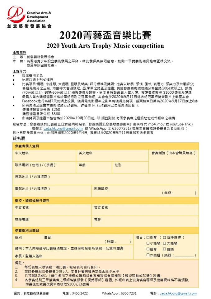 本會除了鼓勵青少年,亦希望鼓勵不同年齡階層、熱愛音樂人士,一起參與音樂活動。 RS10 公開組 (自選曲目組別) RS11 金齡組 (自選曲目組別) PP1 作曲組 (自由創作、樂器不限、不限年齡) 🏵等待你們的參與🏵 報名費用【全免】 比賽以線上形式進行 比賽項目:鋼琴, 小提琴, 大提琴, 豎琴及聲樂 新增項目〈四手聯彈〉 報名日期:由即日起至2020年9月4日 賽果公佈:2020年9月11日電郵至各參賽者 **特設獎項** 《最具人氣大獎》 獲獎者將獲得 $1000 獎金及獎牌 詳情如下: 最具人氣大獎候選影片將於每組組別之冠軍角逐; 本會會於2020年9月11日將各組冠軍得獎者影片上載至本會Facebook進行為期7天的網上投票; 獲得最高點讚率之影片將獲得此獎項; 獎項: 各組最高分之三名參賽者, 均獲得大會頒發冠, 亞,季軍之獎盃及證書; 其餘參賽者將按成績分為金獎, 銀獎, 銅獎, 均獲得大會頒授獎牌及證書; *所有獎項及證書本會將收取行政費用, 有關詳情, 請參閱報名表內容* 各獎項及證書, 協會以順豐到付寄回參賽者之通訊地址或代報名之機構, 敬請留意。