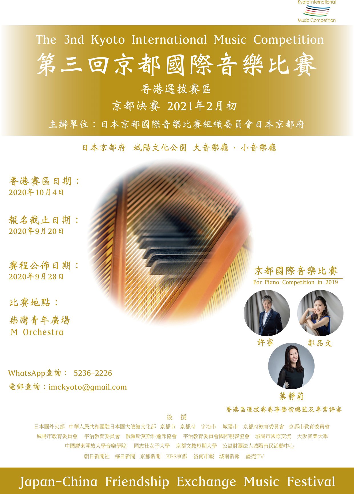 第三回京都國際音樂比賽 - 香港賽區 2020 鑒於疫情雖有點緩和跡象,但確診數字仍然反覆,加上教育局將於九月尾才復課,本會跟評判團相討後,現決定比賽日期延至12月27日必定以實體賽進行,報名截止日期改為12月12日 亦可選擇網上報名, 如有任何查詢, 可whatsapp 5236 2226