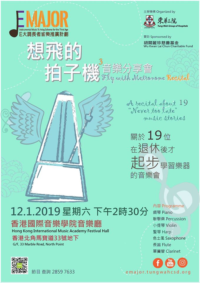 「想飛的拍子機音樂分享會」即將第三年舉行喇! 每年「樂器課程資助項目」學員,藉著E大調計劃的資助得以學習樂器外,亦會參與音樂分享會,一嘗公開演奏,展示努力學習樂器一年後的成果。 2018年十九位在退休後才起步學習樂器的朋友,為了追尋音樂夢,每位都真正活出"Never Too Late"的人生,每個學員的學習經歷和故事都很令人感動、值得敬佩!🎶💪😎 「想飛的拍子機3音樂分享會」(Fly With Metronome Recital)