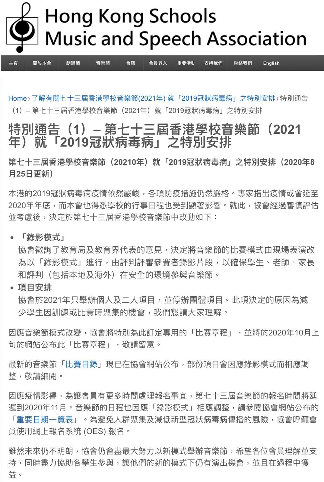 第七十三屆香港學校音樂節(2021年)就「2019冠狀病毒病」之特別安排(2020年8月25日更新) 本港的2019冠狀病毒病疫情依然嚴峻,各項防疫措施仍然嚴格。專家指出疫情或會延至2020年年底,而本會也得悉學校的行事日程也受到顯著影響。就此,協會經過審慎評估並考慮後,決定於第七十三屆香港學校音樂節中改動如下: 「錄影模式」 協會徵詢了教育局及教育界代表的意見,決定將音樂節的比賽模式由現場表演改為以「錄影模式」進行,由評判評審參賽者錄影片段,以確保學生、老師、家長和評判(包括本地及海外)在安全的環境參與音樂節。 項目安排 協會於2021年只舉辦個人及二人項目,並停辦團體項目。此項決定的原因為減少學生因訓練或比賽時聚集的機會,我們懇請大家理解。 因應音樂節模式改變,協會將特別為此訂定專用的「比賽章程」,並將於2020年10月上旬於網站公布此「比賽章程」,敬請留意。 重要日期 網上公布比賽目錄 2020 年 8 月 28 日 網上公布比賽章程及錄影模式參賽須知 2020 年 10 月上旬 會員可於本會網站下載報名表(印刷版) 2020 年 10 月上旬至11 月 26 日 會員可到本會領取《比賽目錄》(印刷版) 2020 年 10 月 29 日起 報名日期 -親臨辦理 2020 年 11 月 11 日至11 月 26 日(下午 5 時) 報名日期 - 網上報名系統 2020 年 11 月 11 日(上午 10時)至 12 月 4 日(下午 5 時) 提交影片連結時段 2021 年 3 月 8 日至3 月 19 日 網上公布比賽結果 2021 年 4 月至 5 月