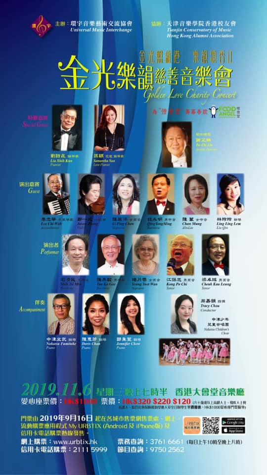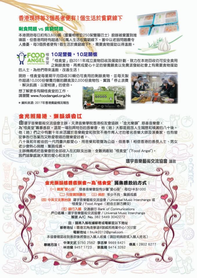 齊集多位資深音樂演奏家和教育家,由環宇音樂藝術交流協會舉辦、天津音樂學院香港校友會協辦。 音樂會將爲"惜食堂"籌募善款。我們誠摯地希望、並感謝各界人士的熱心支持,請踴躍蒞臨觀看指導,並予積極支持!謝謝您的愛心!! ❤愛心票:$1000 🎫正價門票:$320/$220/$120 (長者或學生門票半價) 🙏🏻請大家多多宣傳,邀請親朋好友一起來集腋成裘,共襄善舉!😇🌷 歡迎查詢音樂會詳情! 票務查詢:3761 6661 節目查詢:9750 2562