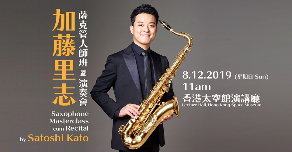 The Japanese saxophone virtuoso Satoshi Kato will share his performing experiences and techniques, and give live demonstration in this masterclass cum recital. Satoshi Kato plays actively in both classical and jazz music, and he frequently participates in stage production and music composition. Graduated from the Senzoku Gakuen college of music, he was awarded the Maeda scholarship and the Maeda memorial prize. He also won numerous awards in various competitions within Japan. As a soloist, Kato performs throughout Japan and also appears on TV shows or radio. He has performed with a lot of chamber music groups, brass bands, and orchestras. In 2018, He took part in Japan tour of “HABANERA × The Blue Aurora” Saxophone Quartet as a performer and a lecturer of the Academy HABANERA. He also gave guest performance in the recital of The Blue Aurora Saxophone Quartet. Besides performances, Kato is also dedicated to pedagogy. He is currently a part-time instructor in the music department of Kai Seiwa High School. He has received twice the Outstanding Coaching Award from Japan Classical Music Association. Interested music educators, saxophone instructors and music enthusiasts shall not miss the precious chance to meet the virtuoso! 日本著名薩克管演奏家加藤里志將分享他的演奏經驗和技巧,並作現場示範。 加藤里志活躍於日本古典樂和爵士樂界,他同時亦經常參與舞台製作和音樂創作。畢業於日本洗足學園音樂大學,獲頒發前田紀念獎學金以及前田紀念獎;他亦曾於多個國內比賽中贏得了許多獎項。 作為獨奏家,加藤里志經常在日本各地演出,並多次現身於電視節目及電台廣播;他亦曾與多隊室樂團,管樂團和交響樂團合作演出。2018年,他以導師及表演者的身份出參與「HABANERA × BLUE AURORA」日本巡迴演出和活動;他亦曾於BLUE AURORA薩克管四重奏的音樂會中擔任表演嘉賓。 除演出活動外,加藤里志亦活躍於教育事業;他現為東邦音樂大學及甲斐清和高等學校的薩克管導師,並曾兩次獲得日本古典音樂協會頒發傑出教師獎。 從事音樂教育人士、薩克管導師及音樂愛好者,切勿錯過!