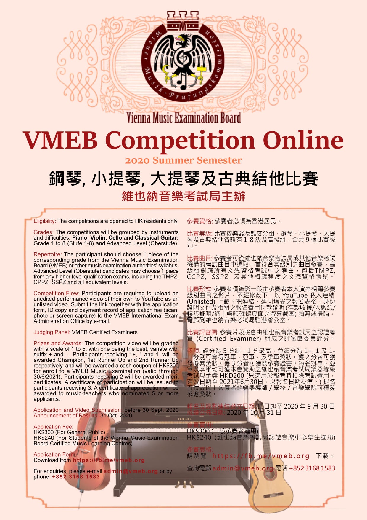 報名及錄影連結遞交日期: 即日起至 2020 年 9 月 30 日 成績公佈日期: 2020 年 10 月 31 日 Application and Video Submission: before 30 September 2020 Announcement of Results: 31 October 2020 參賽費用: HK$300 (一般參賽者適用) HK$240 (維也納音樂考試局認證音樂中心學生適用) Application Fee: HK$300 (For General Public) HK$240 (For Students of the Vienna Music Examination Board Certified Music Learning Centres) 查詢電郵 admin@vmeb.org 電話 +852 3168 1583 For enquiries, please e-mail admin@vmeb.org or by phone +852 3168 1583