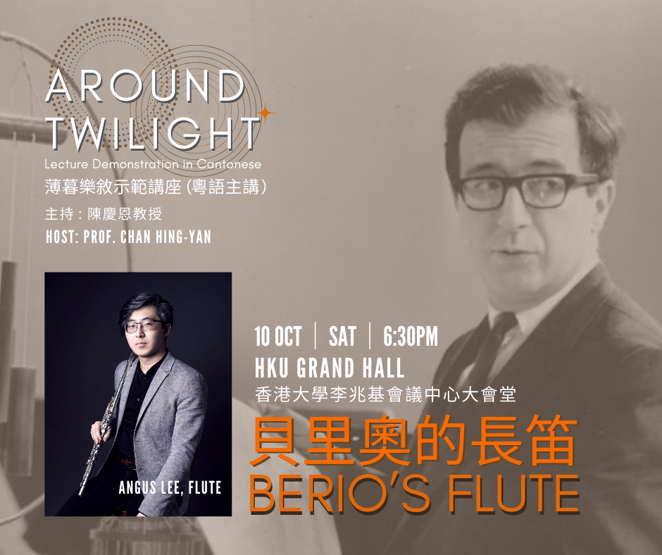 回歸音樂廳 LIVE at the Grand Hall❣️ 全新「薄暮樂敘」示範講座下周登場🌟 A new lecture-demonstration series will come LIVE starting next week! 我們終於可以在音樂廳見面了🤩全新推出的「薄暮樂敘」示範講座系列中,港大音樂系陳慶恩教授將分別與幾位本港青年音樂家進行深度對談,剖析貝里奧、史特拉汶斯基、以及武滿徹獨奏作品的結構和特色。首場講座將於10月10日舉行。新晉長笛演奏家、作曲家李一葦將詳談貝里奧的前衞經典 Sequenza I,並會即席演奏1958年用空間記譜法的版本及1992年的修訂版。 The year-long silence is over! We hope to welcome you back with a brand new lecture-demonstration series featuring Hong Kong’s aspiring young musician. Hosted by Prof. Chan Hing-yan, the first event features flutist-composer Angus Lee. They will discuss many aspects of Luciano Berio’s canonical work Sequenza I, of which Angus will perform two renditions, one from the 1958 proportional notation, and one from the 1992 revised score.