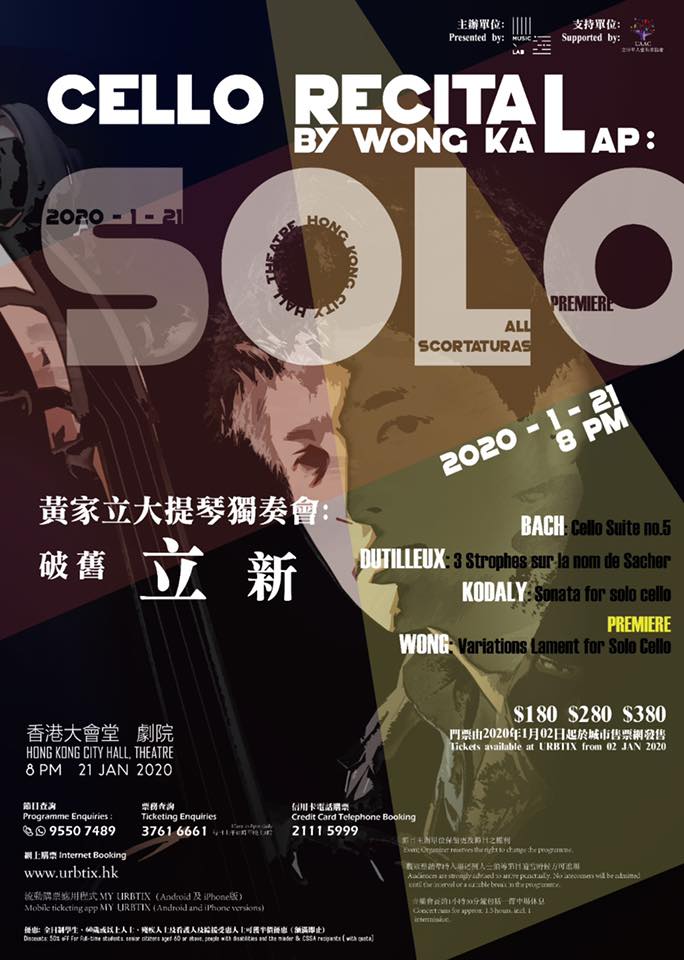 香港本土罕見大提琴獨奏音樂會,香港土生土長的大提琴家黃家立將會演出多首極限級大提琴作品,而且曲目全以scortatura ( 變格定弦)為主。這也是香港大提琴家首次以巴洛克調演出變格定弦版巴哈第五首大提琴組曲 。音樂會更會首演原創本土作品香港大提琴作品 Variations Lament 獨奏將會以不同的演奏技巧及變格定弦去擴闊音域:從巴赫(Bach)最早創作的其中一首管弦大提琴作品到現代作曲家,如高大宜(Kodály)和杜蒂耶(Dutilleux) ,令聽眾感受到另類的異域大提琴音色。 黃家立是亞洲公認出色的大提琴演奏家,曾於香港管弦樂團,香港小交響樂團,馬來西亞愛樂樂團等樂團演出。 除此之外,他是創新室內樂合奏團The TimeCrafters的藝術總監和創始人,該團體曾在香港藝術節,汕頭鋼琴博物館,法國五月音樂節,香港藝術館,香港西九龍文化區,台北大師音樂節和新加坡鋼琴節演出。 除了擁有豐富及專業室內和管弦樂隊經驗外,黃氏也是一名獨奏家,並受邀與不同樂團演奏海頓大提琴協奏曲(D大調),貝多芬三重奏協奏曲,蕭士塔高維奇大提琴協奏曲和普羅科菲耶夫交響協奏曲。 黃氏受得了世界各地音樂家的廣泛讚譽,弗拉基米爾·佩林(Vladimir Perlin)將黃氏譽為“天賦極高”,羅伯特·薩克斯頓(Robert Saxton)稱他為“出色的大提琴手”,波波夫和理查德·班賓(Richard Bamping)都稱讚他為“可以演奏任何東西的大提琴手”,“卓越”-埃文·羅斯斯坦(Evan Rothstein)