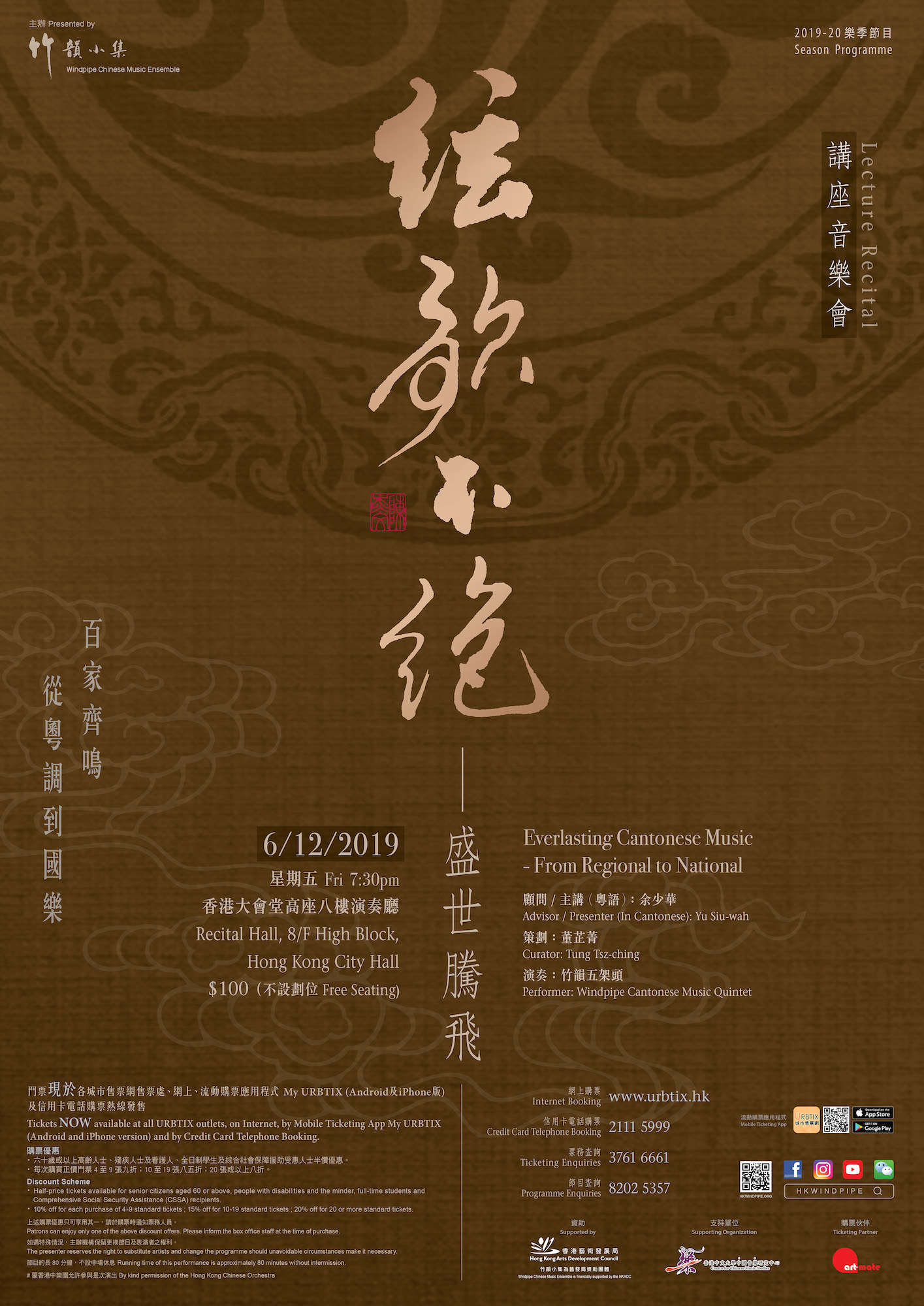 竹韻小集以「植根本土、重視傳統」為藝術理念,多年來積極向海內外推廣香港粵樂文化而深獲好評。所謂「鑑古知今」,在演奏當代粵樂的同時,亦不能忽視前人遺留下來的文化瑰寶。 2019-20樂季起,樂團推出「絃歌不絕」計劃,以丘鶴儔編撰之香港首本粵樂教本《絃歌必讀》(1916)為藍本,重新整理並復刻早期的粵樂演奏形式,窺探民初粵文化之風貌及嬗變。計劃以講座音樂會形式進行,由竹韻小集現場演奏及專家主講,使觀眾在欣賞音樂的同時,可以了解粵文化的源流及故事,增進大眾對粵樂的了解。 二十世紀的二、三十年代香港粵樂名家雲集,創作繁盛,開創了粵樂發展的黃金年代。從丘氏首本著作《絃歌必讀》(1916)至最後一本《國樂新聲》(1934),粵樂這十多年間更出現了「從粤調到國樂」的角色轉變。第二場講座音樂會「盛世騰飛」由民族音樂學家余少華教授分享他對丘氏出版的樂譜之研究成果,了解社會和音樂的關係。