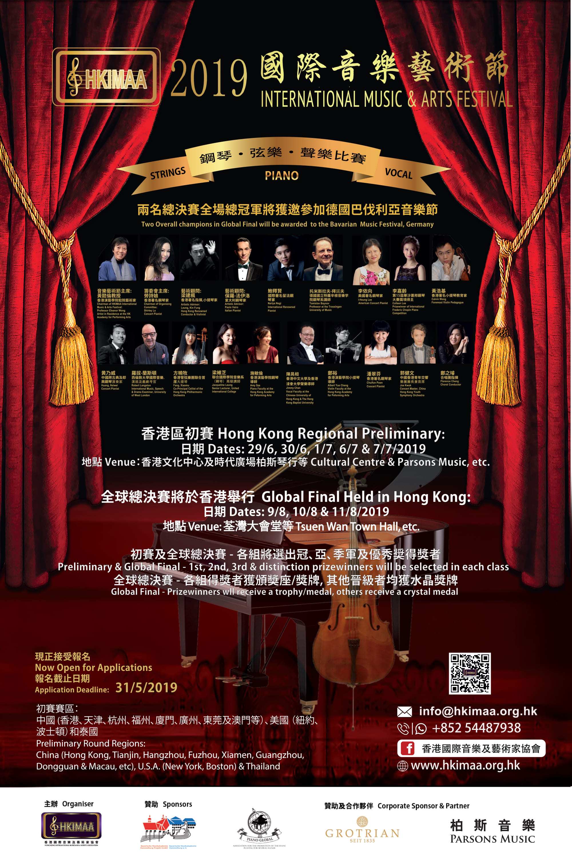 HKIMAA 2019國際音樂藝術節 <比賽現正接受報名> 承蒙黃懿倫教授及著名音樂家們支持這國際音樂比賽,讓孩子在台上盡顯才華,得到評審的肯定及評價,進一步提升音樂造詣! 比賽在全球十多個城市進行初賽選拔,世界各地之優勝者將晉級於香港舉行之全球總決賽, 進行比賽音樂交流。 初賽及總決賽分設冠、亞、季軍及優秀獎,獲頒獎杯/水晶獎牌及獎狀,其他參賽者均獲獎狀。 兩名全場總冠軍將獲邀參加德國哈密爾堡巴伐利亞音樂節。 ⭐賽事資料 樂器:鋼琴、小、中、大提琴及聲樂 比賽章程 hkimaa.org.hk/brochure ⭐舉行日期及地點 香港區初賽日期:29 & 30/6 & 1, 6 & 7/7/2019 地點:香港文化中心或銅鑼灣柏斯琴行等 全球總決賽於香港舉行:9, 10 & 11/8/2019 截止報名日期:31/5/2019 ⭐報名 個人報名: hkimaa.org.hk/H/Index/baoming 團體報名: 下載電腦填寫版:https://bit.ly/2SNvjCu 下載手寫版:https://bit.ly/2tuHjcZ 🎹🎻🎤踏上舞台 · 期待你的演出