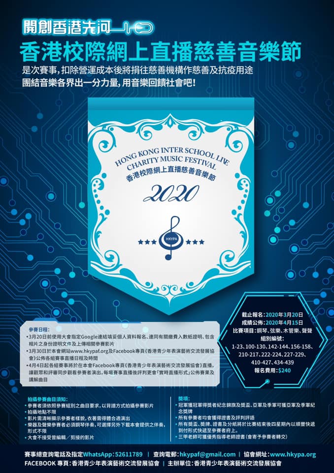 期間限定 - 香港校際網上直播慈善音樂節2020 因新型冠狀病毒肆虐本港,大家苦練多月既香港學校音樂節既樂曲被逼取消;本會特別使用[開創香港先河]直播賽事形式打造為了讓同學仍有發揮預備已久的機會,本會決定舉辦 《期間限定 - 香港校際網上直播慈善音樂節2020》! 是次賽事,扣除營運成本後將捐往慈善機構作慈善及抗疫用途;讓我們團結音樂各界出一分力量,用音樂回饋社會吧! 所有參賽影片會使用直播技術讓觀眾和評審同步觀看參賽者演出,參賽者可透過直播賽事觀摩和學習彼此努力多月成果,實時直播評審更能有效確保比賽透明度及公平性! 本次賽事評審由歷屆香港學校音樂節公開組得獎者擔任,部分評判更曾過去於香港學校音樂節擔任評判,每場賽事直播後評判更會「實時直播形式」公佈結果及講解曲目;給你十足還原度! 參賽者只需使用手提電話拍攝一段校際曲目影片,足不出戶就可參與! 參賽日程: 1. 3月20日前使用大會指定GOOGLE 連結網上報名 、連同有關繳費入數紙$240 銀行入數紙或網上轉帳截圖 ( 中國銀行戶口 : 012-889-0-014318-3 / 戶口名稱 : HKYPA ) / PAYME 92538864 (轉帳後截圖)證明、包含相片之身份證明文件及發送相關參賽影片 2. 3月30日於本會網站www.hkypaf.org及Facebook專頁《香港青少年表演藝術交流發展協會》公佈各組賽事直播日程及時間 3. 4月4日起各組賽事將於在本會Facebook 專頁《香港青少年表演藝術交流發展協會》直播評審 拍攝參賽曲目須知: 1. 參賽者須依照參賽組別之曲目要求,以背譜方式拍攝參賽影片 2. 拍攝地點不限 3. 影片需清晰顯示參賽者樣貌,衣著得體適合演出 4. 樂器及聲樂參賽者必須鋼琴伴奏,可選擇另外下載本會提供之伴奏音樂(只有小提琴,聲樂),形式不限 5. 大會不接受曾編輯/剪接的影片 奬項: 1.冠軍獲冠軍得獎者紀念錦旗及獎盃、亞軍及季軍可獲亞軍及季軍紀念獎牌 2.所有參賽者均會獲得證書及評判評語 3.所有奬盃、奬牌、證書及分紙將於比賽結束後四星期內以順豐快遞到付形式快遞至參賽者府上。 4.三甲老師可獲優秀指導老師證書(會寄予參賽者轉交)