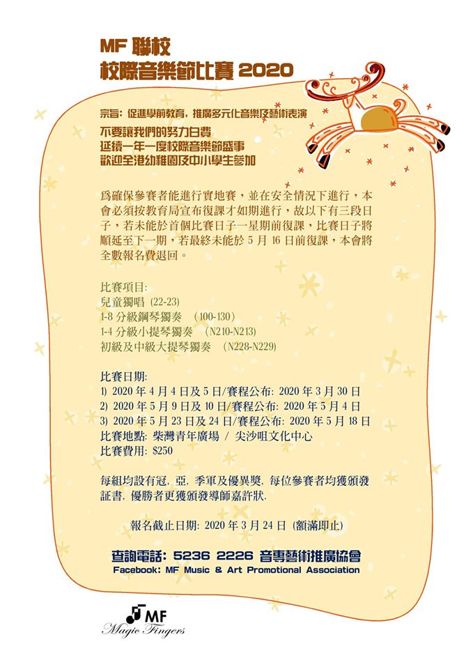 🎹🎹🎻🎻🎤🎤把握良機, 不要白費付出的努力,延續一年一度校際音樂節盛事......怎能缺少實地賽? MF聯校校際音樂節比賽2020, 現正接受報名, 只接受網上報名, 名額有限, 額滿即止。 為確保參賽者能進行實地賽,並在安全情況下進行,本會必須按教育局宣布復課才如期進行,故以下有三段日子,若未能於首個比賽日子一星期前復課,比賽日子將順延至下一期,若最終未能於5月16日前復課,本會將全數報名費退回。 比賽項目: 兒童獨唱 (22-23) 1-8分級鋼琴獨奏 (100-130) 1-4分級小提琴獨奏 (N210-N213) 初級及中級大提琴獨奏 (N228-N229)