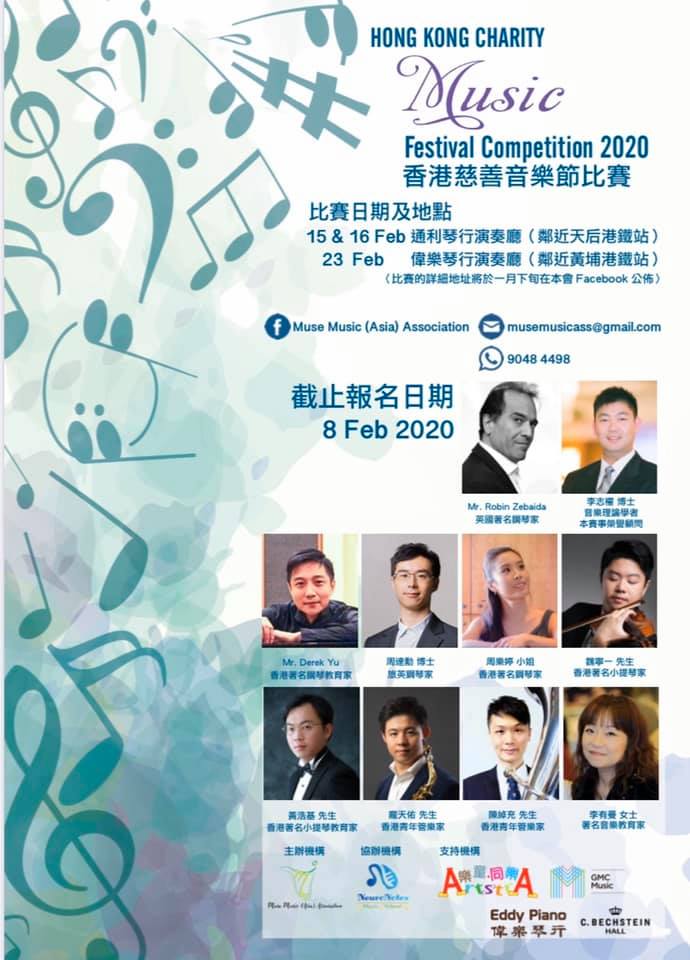 2020香港慈善音樂節比賽已經開始接受名 本會原定15/2 16/2 及23/2 的賽事及較早之前延期為3月7號及8號賽事現已取消。因現時香港疫症嚴峻,本會決定更改賽事日期為29/3 星期日、4/4星期六及 5/4 星期日在紅磡黃埔偉樂琴行演奏廳,另外我們亦會個別通知較早前已安排了3月7號或8號進行比賽的參賽者作出適當的安排,請耐心等候!此外我們亦會相應延遲截止日期為 22/3晩上12 時止。 每年一度學界音樂盛事,今年除鋼琴比賽以外,更新增各類弦樂、管樂及聲樂組別,本會更邀請到來自擔任校際音樂節的海外及香港的評判陣容,詳情可留意Muse Music Asia Association專頁