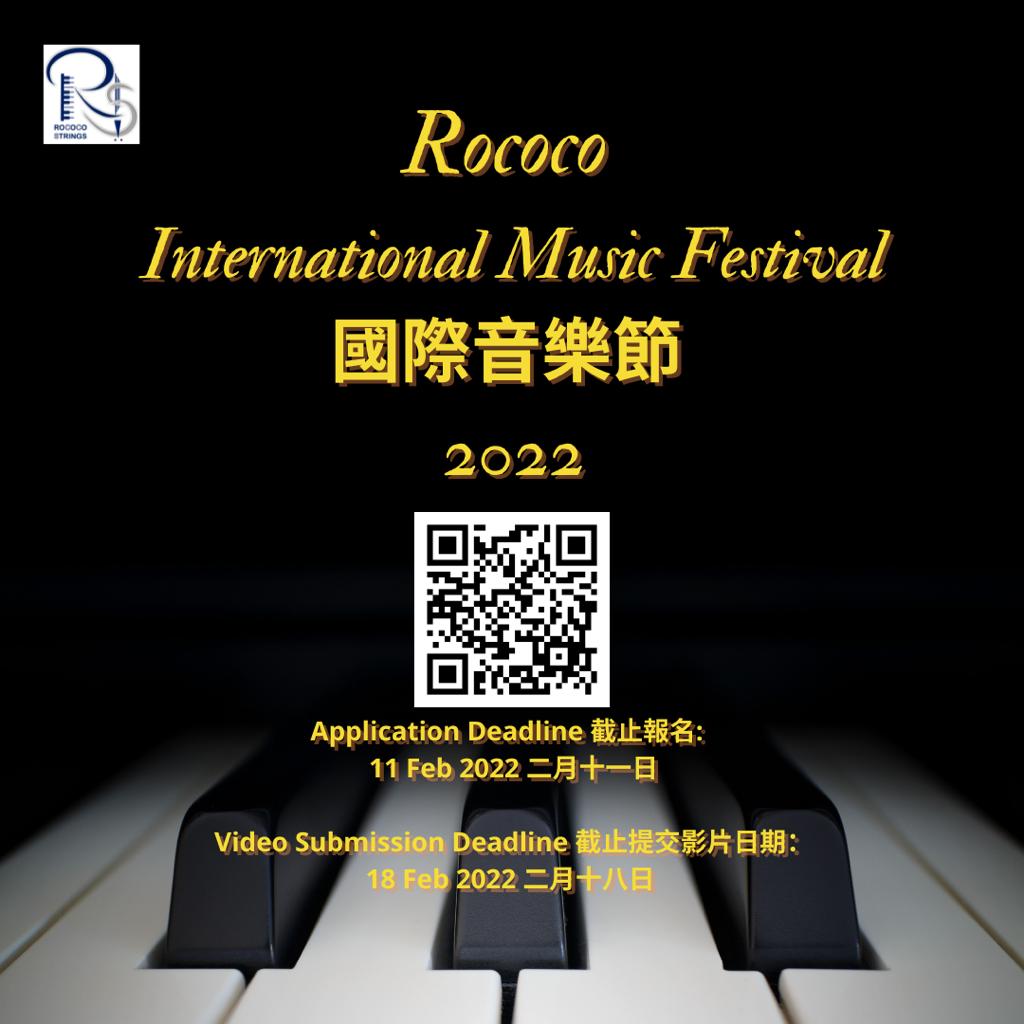🎼 Rococo International Music Festival 國際音樂節 2022 🎼 比賽總類:自選樂曲組、指定樂曲組 Category: Own Choice Piece Category & Set Piece Category 分類:獨奏、二重奏、合奏、室樂 Types: Solo, Duo, Ensemble & Chamber 樂器組別:聲樂、鋼琴、弦樂、吹管樂、敲擊樂、豎琴 Instrument: Vocal, Piano, Strings, Winds, Percussion & Harp 比賽形式:網上 Mode: Online 評判團:海外及本地的音樂家及音樂教育家 Adjudication Panel: Overseas and local musicians and music educators