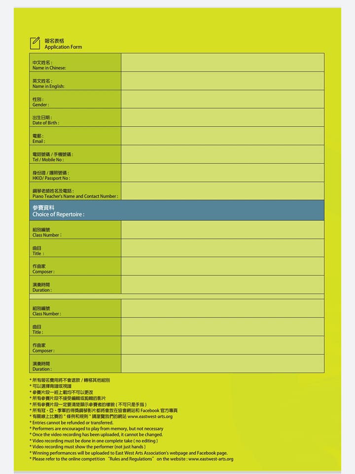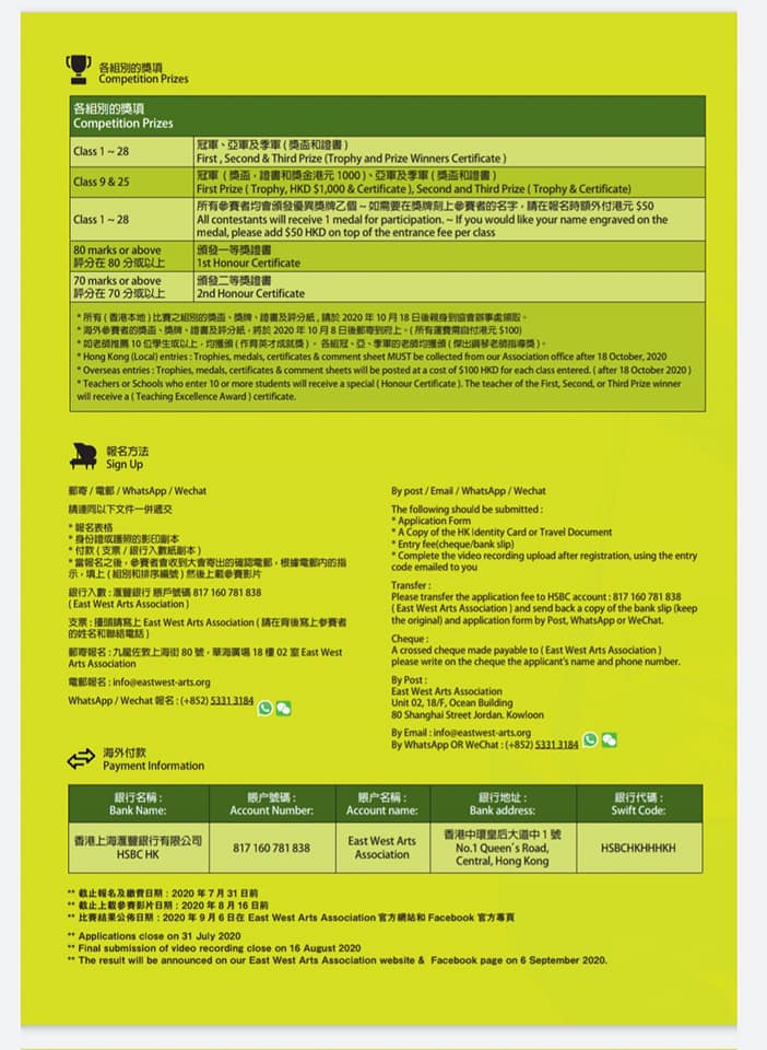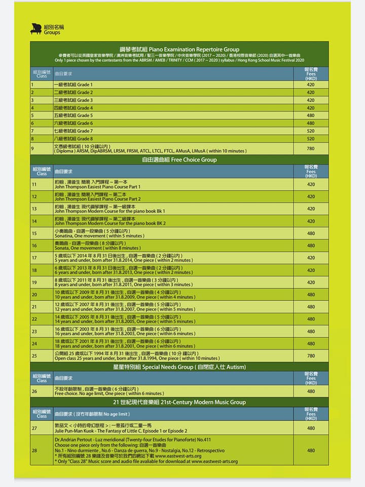 重量級專業評審團 ⭐郭品文小姐 🇭🇰香港鋼琴家和指揮家 ⭐Dr. Andrian Pertout 🇨🇱智利作曲家 ⭐Mr Guy Cremnitz 🇬🇧英皇鋼琴考試官 ( ABRSM ) ⭐蔡崇力教授 🇭🇰🇲🇴香港及澳門鋼琴家和指揮家 ⭐Mr Robert Sipos-Ori 🇦🇺澳洲鋼琴考試官 ( AMEB ) 🇭🇺匈牙利鋼琴家 ⭐Dr. Michael Giddens 🇦🇺 澳洲音樂考試官 ( AMEB ) ⭐ Ms Lilit Gevorkyan 🇷🇺 俄羅斯鋼琴家 ⭐Ms Kathleen Chang 🇲🇾東馬來西亞鋼琴家 ⭐丘宏小姐 🇭🇰 澳洲註冊音樂治療師 ⭐Ms Marta Majka 🇭🇺 匈牙利鋼琴家 ⭐Mr Robert Hardwick 🇦🇺 澳洲鋼琴教育家 ⭐Dr. Qmars Piraglu 🇮🇷🇸🇪 伊朗及瑞典鋼琴家 ⭐ Ms Vivian Horn 🇦🇺 紐西蘭鋼琴家和指揮家 ⭐ Ms Sherley Teo 🇸🇬 新加坡鋼琴教育學家 參賽組別 💥鋼琴考試組 💥自由選曲組 💥星星特別組 💥21世紀現代音樂組 各組別詳情請瀏覽 www.eastwest-arts.org 💥所有參賽者均會獲得優異獎牌乙個 ~ 如需要在獎牌刻上參賽者的名字,請在報名時額外付港元$50。 截止報名及繳費日期 : 2020年7月31日前 截止上載參賽影片日期 : 2020年8月16日前 * 所有參賽片段一定要清楚顯示參賽者的樣貌( 不可只是手指) * 所有參賽片段不接受編輯或剪輯的影片 * 參賽片段一經上載均不可以更改 * 可以選擇背譜或視譜 * 所有報名費用將不會退款/轉移其他組別 * 所有冠、亞、季軍的得獎鋼琴影片都將會放在協會網站和Facebook 官方專頁。 * 有關線上比賽的"條例和規則",請瀏覽我們的網站 www.eastwest-arts.org 公佈比賽結果日期 : 2020年9月6日在East West Arts Association 網站和大會官方 Facebook 專頁